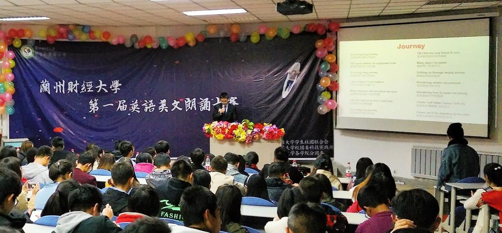 10月18日,由共青团兰州财经大学委员会主办,校团委科技实践部各部门、学生社团联合会承办,各二级学院科技实践部协办的兰州财经大学第一届英语美文朗诵大赛于知行楼104教室顺利举行。兰州新东方雅思阅读写作牛建飞老师、兰州新东方托福口语何富康老师、兰州新东方托福阅读写作王凯岩老师、外语学院剡科斗老师、创新创业学院慕丹老师出席本次大赛并担任评委。