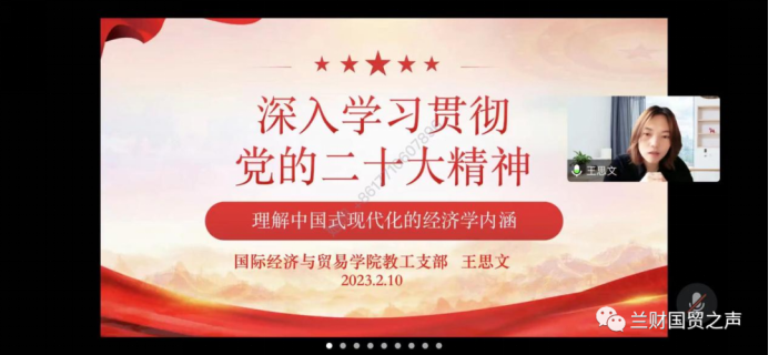 草木蔓发,春山可望。初春二月,为更好地促进研究生党员深刻领会党的二十大精神,研究生院国贸学生第一、二党支部邀请学院副院长、产业经济学专业硕士研究生导师王思文教授为学院研究生党员讲党课,我院所有研究生党员参加了本次活动。